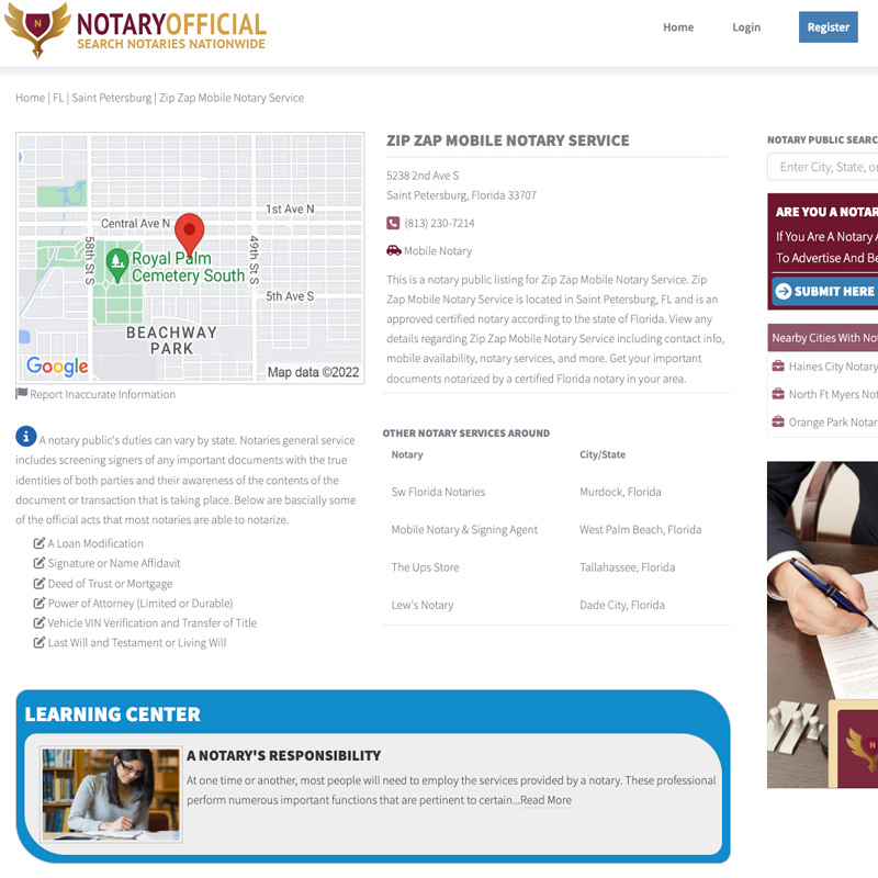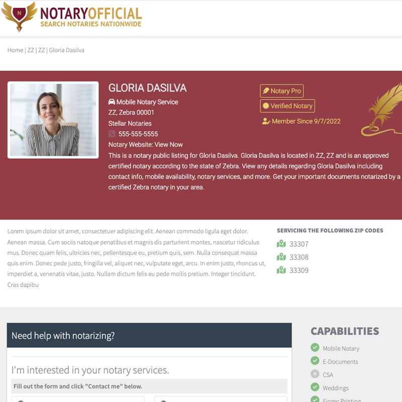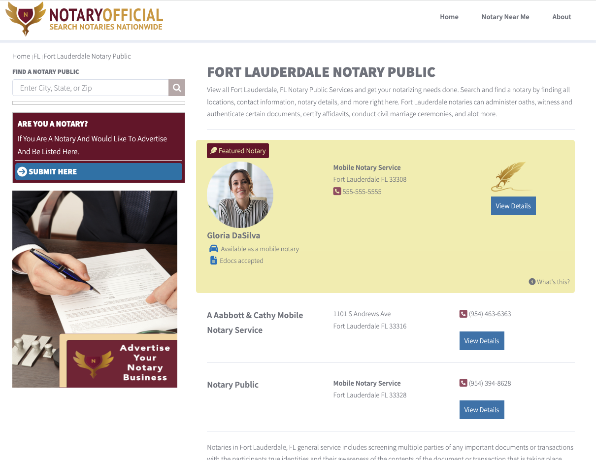A listing on includes your business name, address (optional), phone number, notary services, website (optional), a short description, and more. It's very easy to list your notary service, attract more business. Check out the examples below.